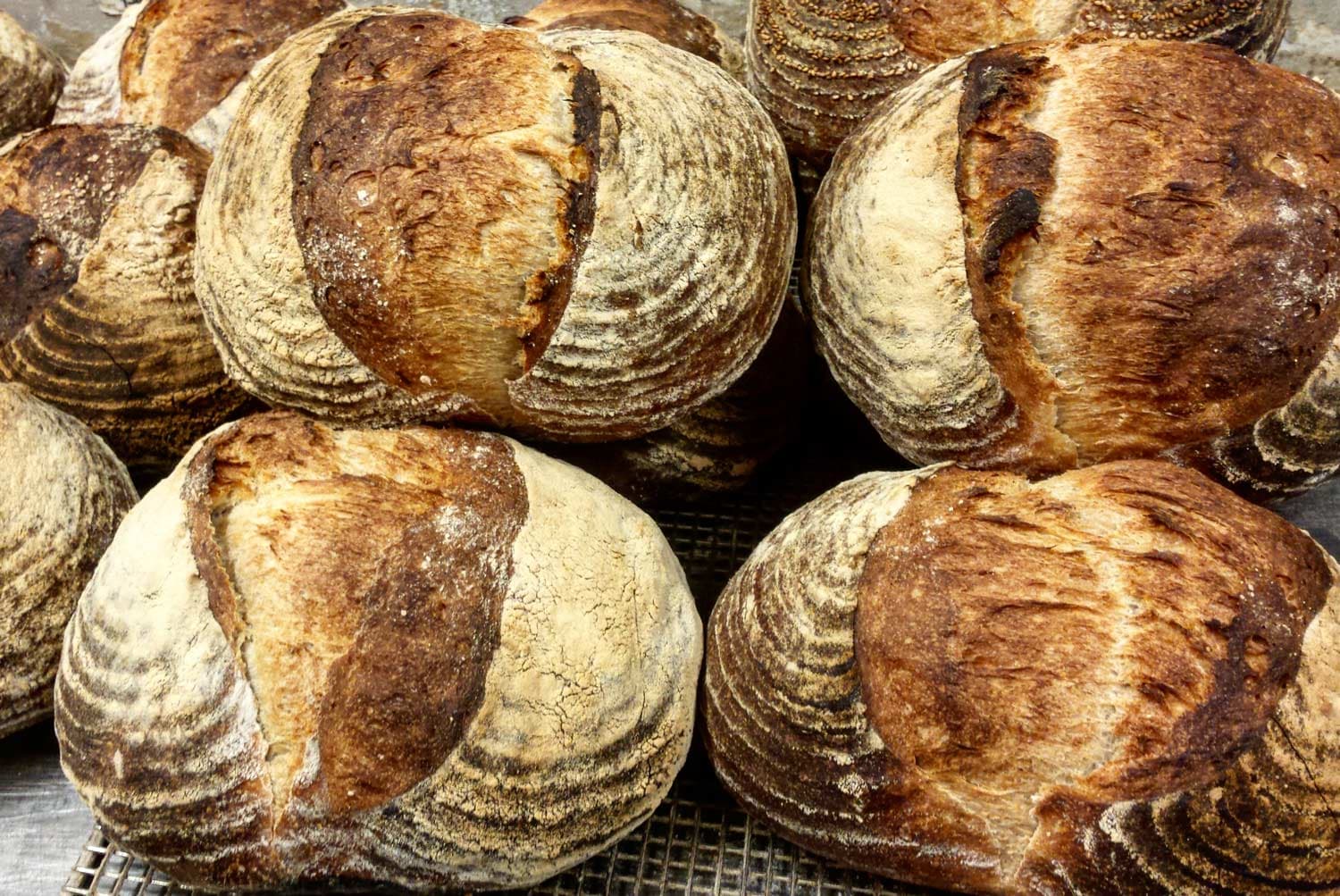 A stack of freshly baked loaves at the author’s Ottawa bakery, Bread by Us