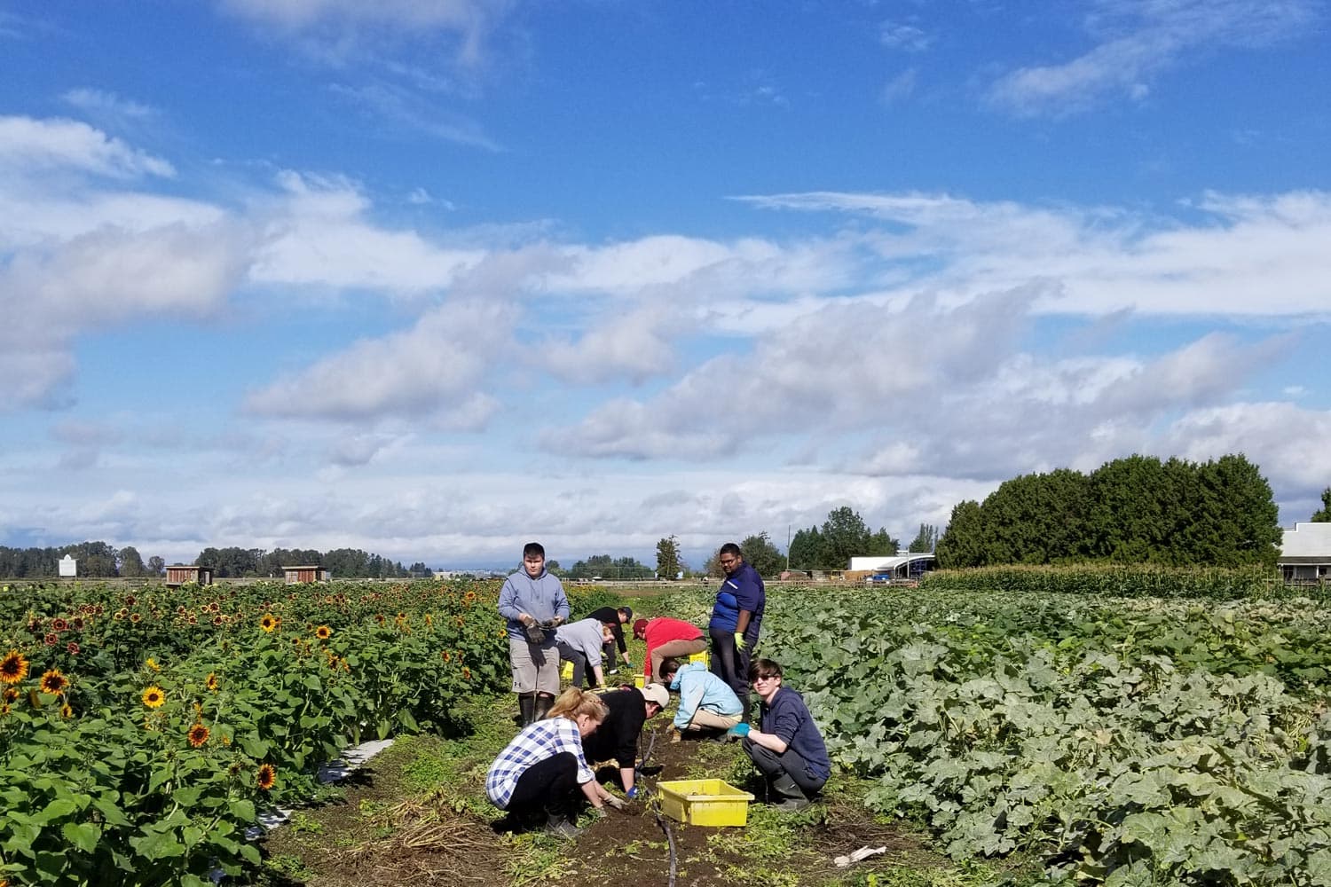 Students from Farm Roots Mini School in Delta, BC, help out in the fields at Schoolhouse Farm, also in Delta.