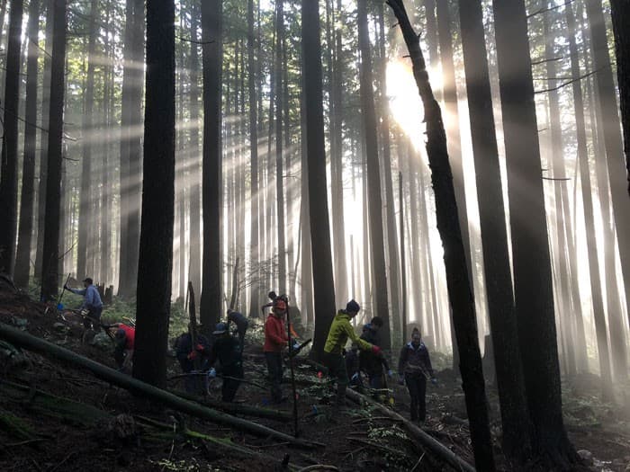 A team of NSMBA volunteers make improvements to the Dale’s Connector trail, on Mount Seymour.