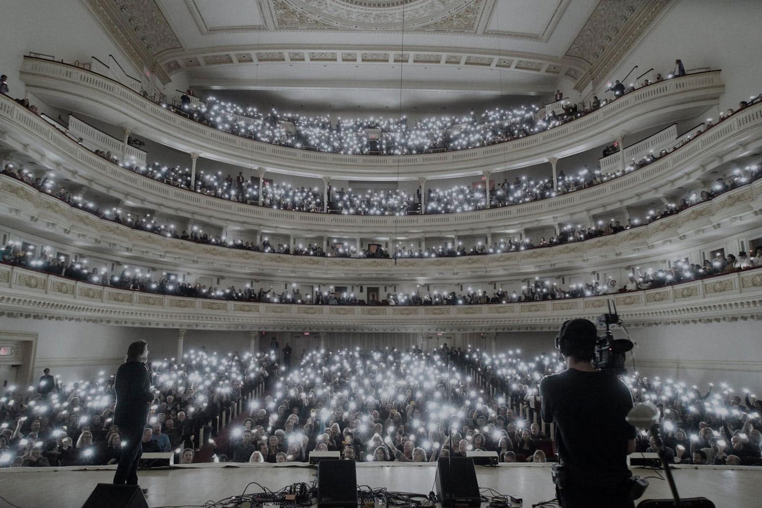 Visual artist Olafur Eliasson leads a packed Carnegie Hall audience in creating a “sunrise” with solar-powered Little Sun lamps, at the December 2017 Pathway to Paris concert.