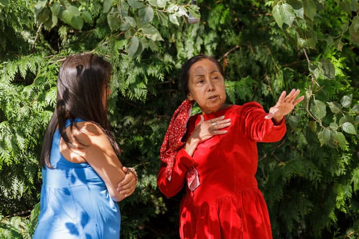 Tsimshian and Haisla artist Crystal Smith (pictured, left, with Kat Zucomulwut Norris) created Saving Mother for the 2017 Vines Art Festival. On August 17 and 18 she’ll present a new commission as part of this year’s Resilient Roots program.