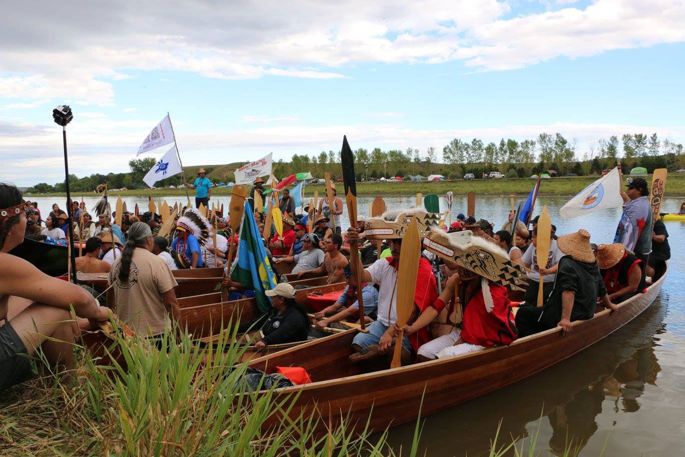 Indigenous activists arriving at Standing Rock by canoe in September 2016.