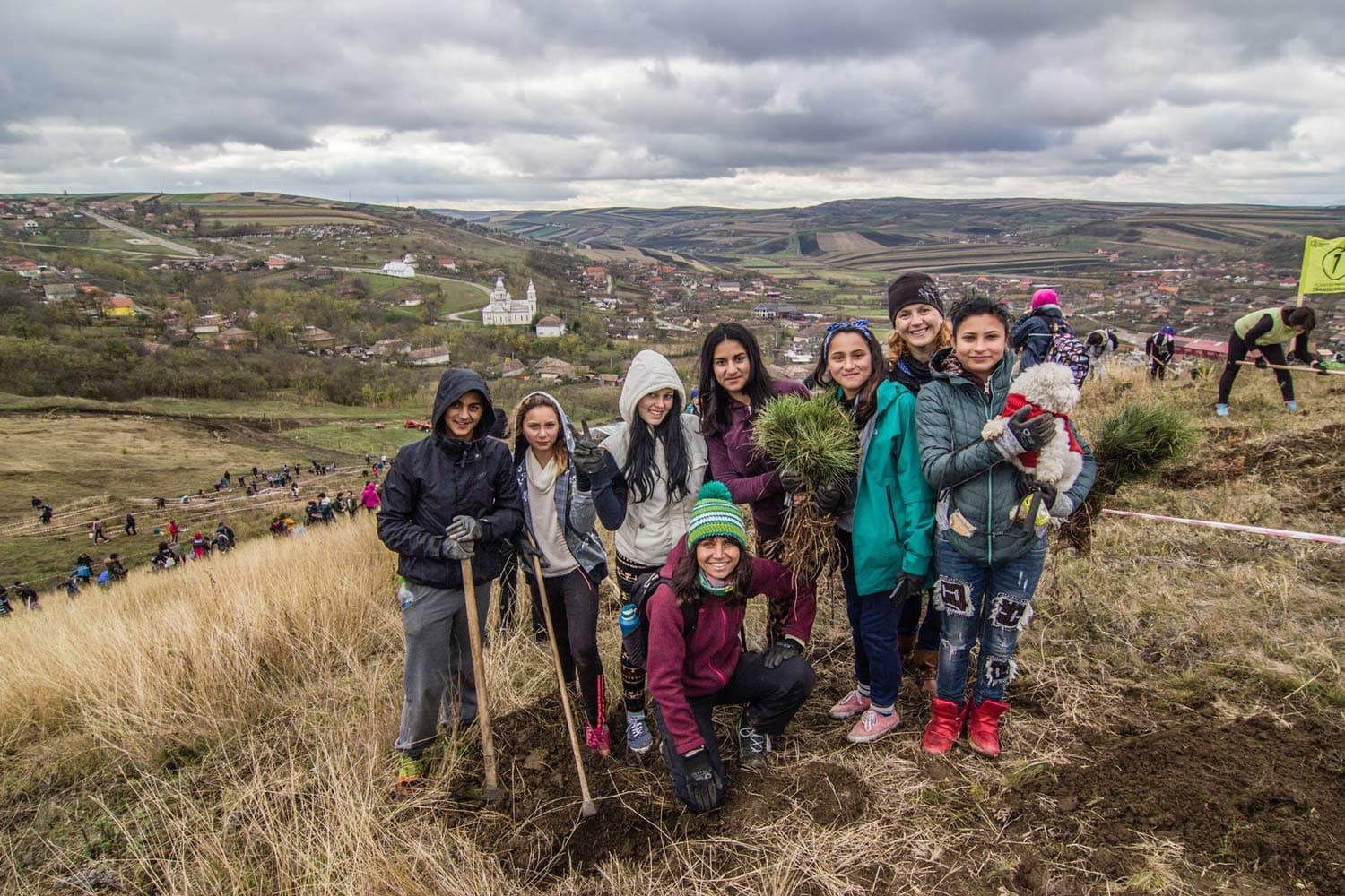 Teenage volunteers participate in a tree-planting event put on by Romanian charity Taşuleasa Social.