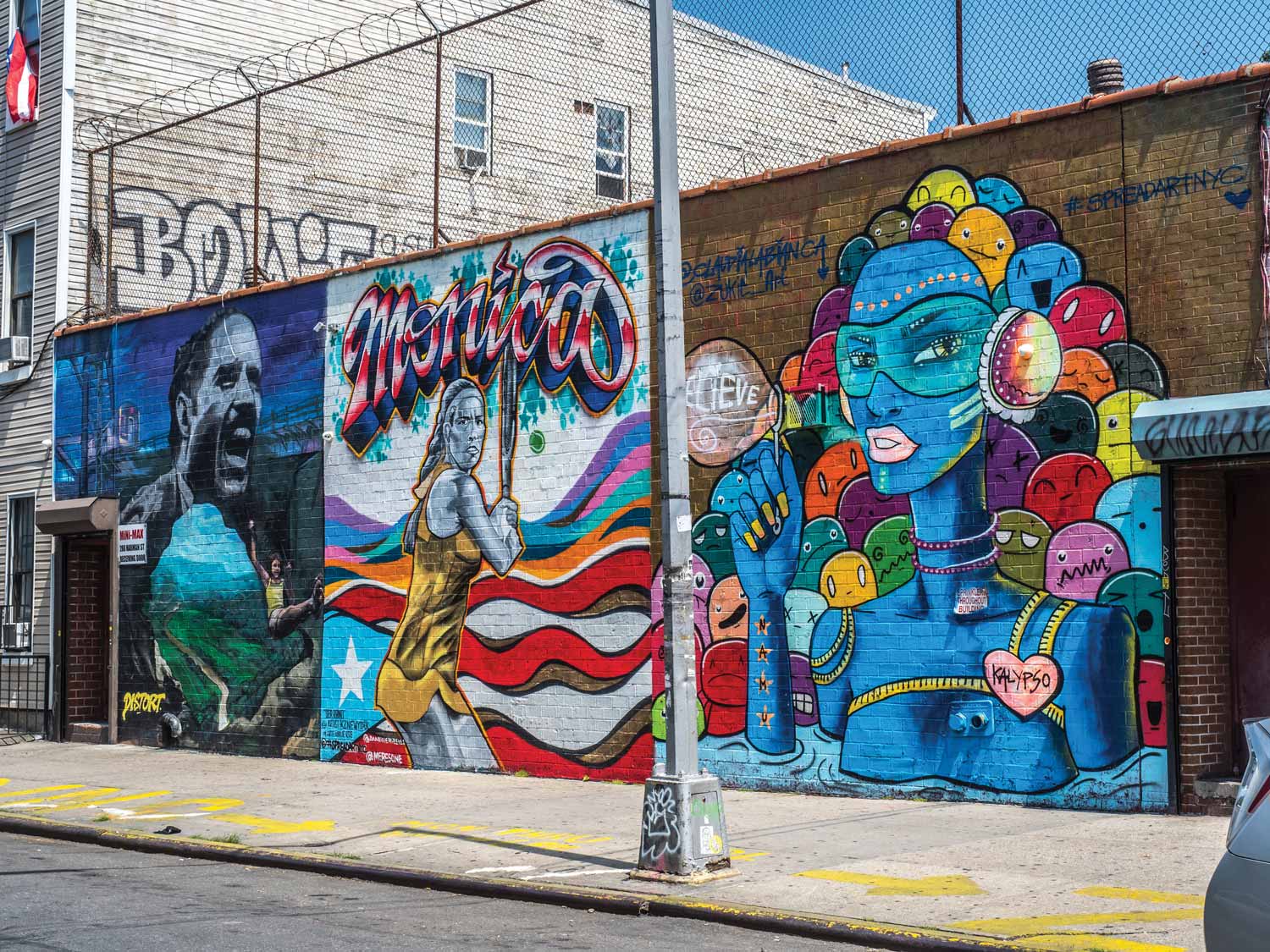 Two doors down from the starting spot is a wall of vibrant murals featuring prominent Puerto Rican figures, including independence advocate Pedro Albizu Campos, baseball legend Roberto Clemente, and champion boxers and Bushwick natives, sisters Amanda and Cindy Serrano.